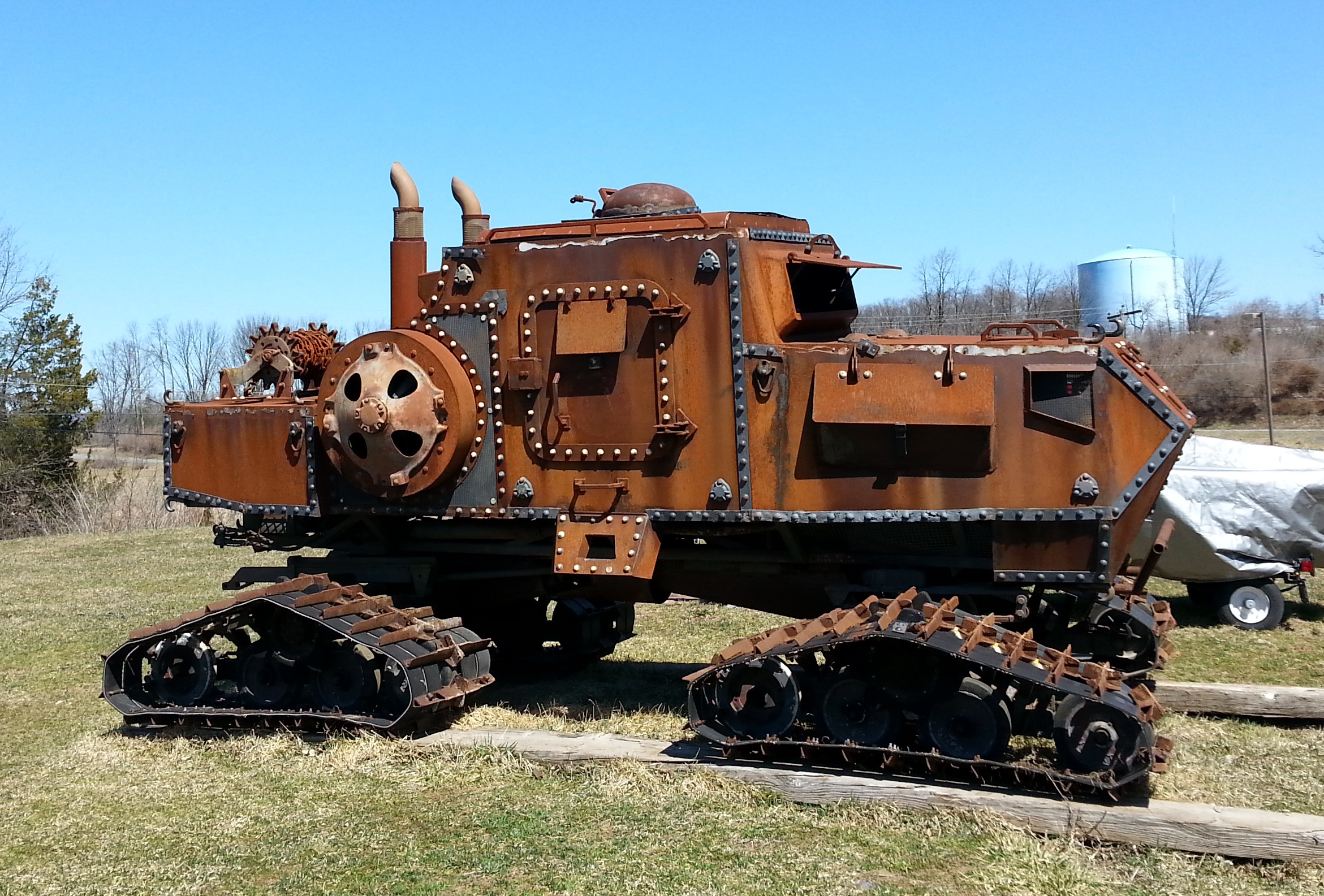 I remember seeing this beast on ebay a few years ago, Was listed as a modified snow cat for a movie, not sure of the details though, sorry. I saved a few of the images from the listing when i saw it, http://imgur.com/a/n4VIJ Sorry for the potato quality, but either they made a few of these things, or this is it, in slightly less rust, including a good shot of the engine bay.