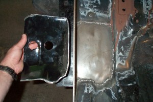 After cutting out these areas, several pieces of 1/4 inch steel were cut to fit under an inset area that would eventually support the transmission’s polyurethane mount. Because this steel is located below the skid plate, it effectively lowers the drive train slightly helping to reduce the drive shaft angle.