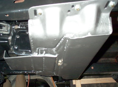 With these pieces fabricated and welded in, attention was turned to protecting the transmission mount bolts that would hang below the skid plate. Adding protection to these bolts was just a matter of extending the forward section of new 1/4 steel back to the bolts and welding it to the new steel in the inset section of the skid plate.